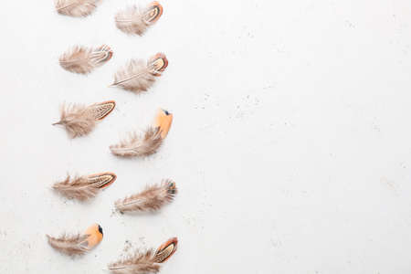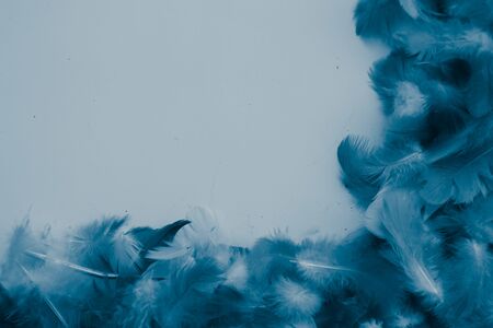 Beautiful abstract colorful gray and blue feathers on white background and soft white feather texture on blue pattern and blue background, colorful feather, white banners