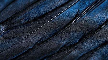 Close-up view of delicate dark blue feathers with intricate textures illuminated by soft light