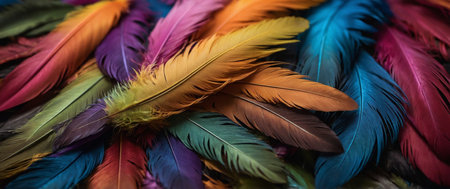 Abstract feather background. Colorful bird feathers close up. Exotic natural textured backdrop. Generative AI.