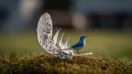 A small bluebird is captured perched on a feather decorated with musical notes. The image displays soft lighting, with a blurred background of green and brown. The composition suggests an outdoor setting, possibly a field. This image is suitable for various editorial and commercial purposes.