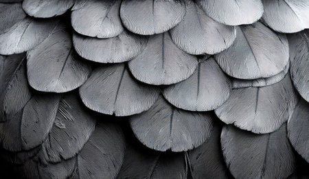 This image presents a detailed view of feathers, showcasing an arrangement of overlapping, grey scales. The texture is smooth with visible fine lines. The composition suggests an overhead perspective, possibly taken in daylight. Suitable for visual concepts and designs, the image is appropriate for various commercial applications.