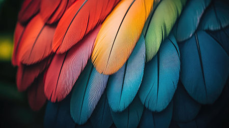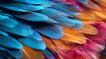 A close view of brilliantly colored feathers reveals intricate patterns and textures, emphasizing the beauty of nature and avian diversity.