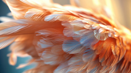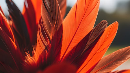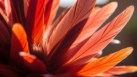 A macro shot details the texture and structure of vibrant orange-red bird feathers, backlit by sunlight. The image captures the delicate patterns and natural beauty of avian plumage.