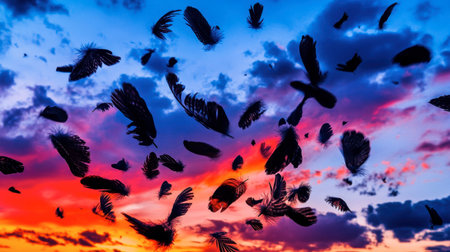 A stunning display of feathers swirling in a vibrant sunset sky. This image captures the beauty of nature blending with artistic expression, creating an enchanting view.