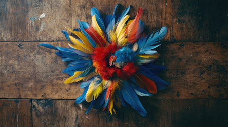 This vibrant arrangement of colorful feathers creates a striking visual contrast against a rustic wooden background, ideal for artistic and decorative themes.