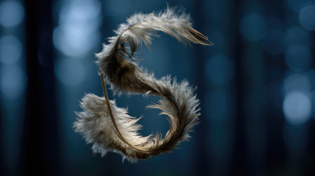 This abstract artistic shot captures ethereal feathers floating gracefully through a dreamy forest, illuminated by soft light. Perfect for conveying tranquility and serenity.
