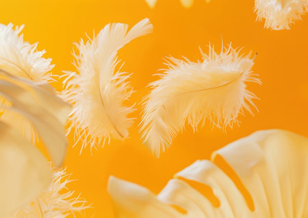Delicate white feathers floating gracefully against a vibrant yellow background, creating a sense of lightness and tranquility.