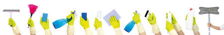 Spring cleaning concept. Top view of hand in yellow rubber gloves holding different cleaning supplies. The concept of cleaning service