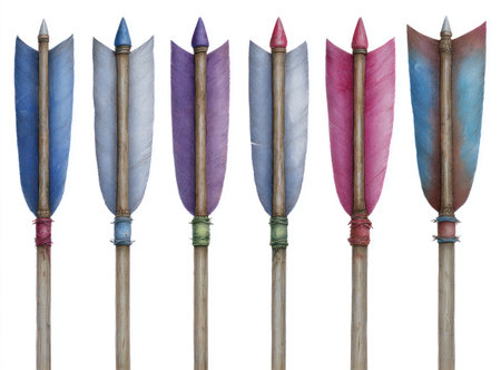 An assortment of arrows with feathered fletching are displayed against a white backdrop. The arrows exhibit a variety of colors and patterns with visible textures. The composition features a symmetrical arrangement, offering a clean, studio-lit presentation suitable for various design and advertising projects.