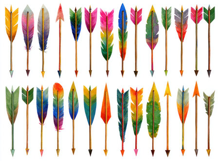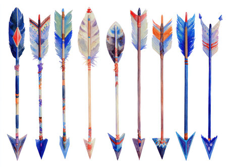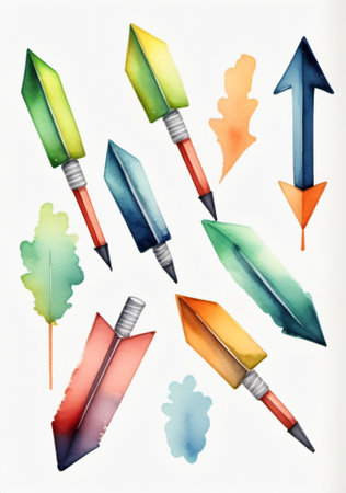 This image features a collection of watercolor arrows, each with vibrant feather fletching. The arrows display a range of colors and designs. The composition is likely intended for artistic or decorative purposes. These illustrations could be suitable for various design projects and commercial applications.