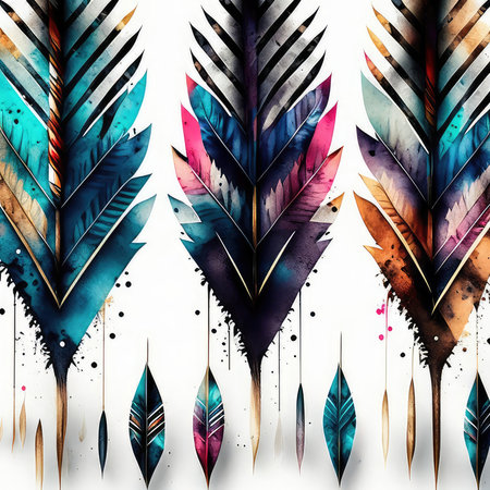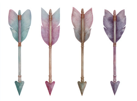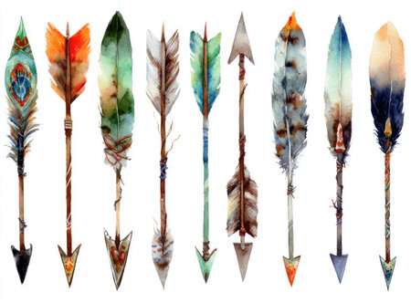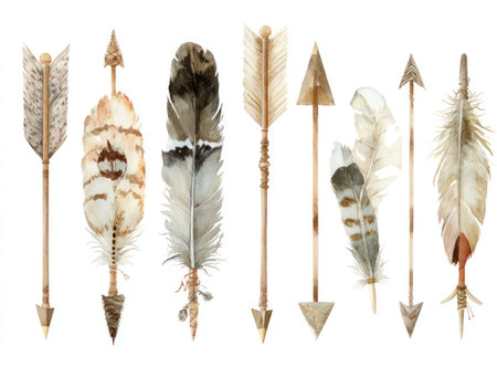 These watercolor arrows with attached feathers are presented on a white background. They showcase a variety of natural colors and textures, creating a visually appealing composition. The lighting appears soft, potentially suitable for a range of creative and design applications, including decorative elements or artistic displays.
