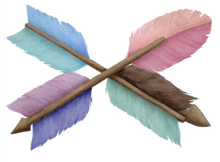 Two watercolor arrows are depicted crossing each other against a white background. The arrows showcase a blend of pastel colors, with each featuring a differently colored feather. The composition exhibits a detailed artistic style, and can be suitable for a variety of designs and projects.