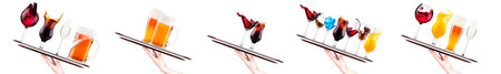 Hand holding tray with different alcohol cocktails like beer, martini, soda, champagne, whiskey isolated on white background