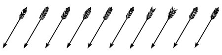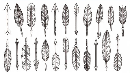 A collection of twenty-four hand-drawn line art arrows and feathers, varying in style and detail, on a white background