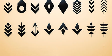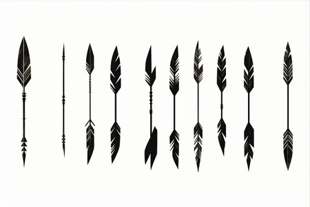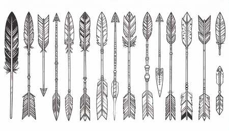 A collection of sixteen intricately detailed, monochrome arrows adorned with feathers and geometric patterns, presented against a stark white backdrop