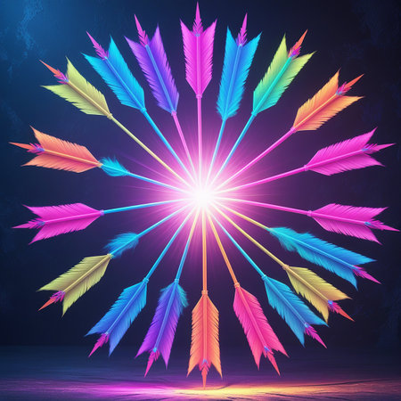 A radial burst of brightly colored feathered arrows emanating from a brilliant central light source.