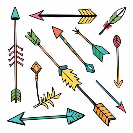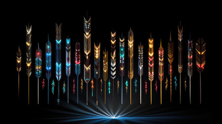 This vibrant artwork showcases a creative arrangement of traditional arrows, featuring intricate patterns and bold colors, perfect for enhancing artistic projects.