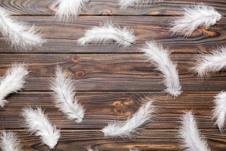 Light white feather on wooden table