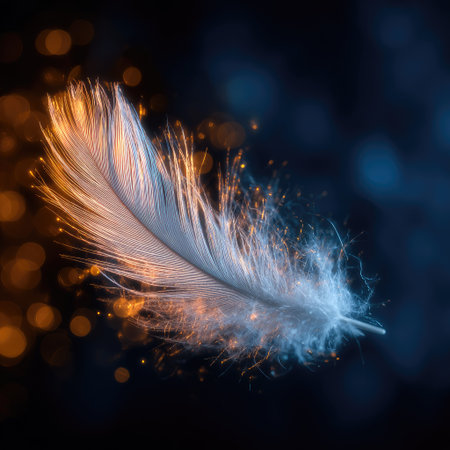 A soft feather gently floats in mid-air, its delicate strands illuminated by soft blue light, creating a calm and peaceful atmosphere.