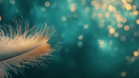 A delicate feather rests against a soft background filled with dazzling bokeh effects, creating a tranquil and artistic atmosphere perfect for inspiration.