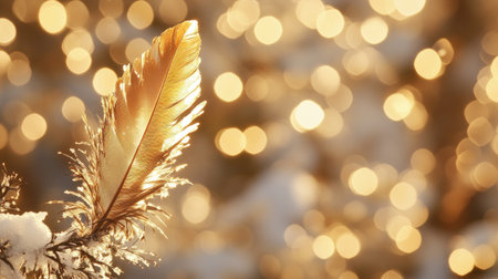 An enchanting golden feather rests on a snow-covered branch, glistening amidst a dreamy background of soft, shimmering lights, creating a serene winter scene.