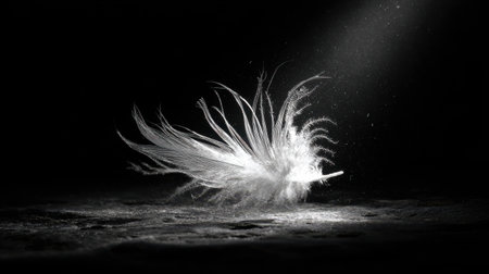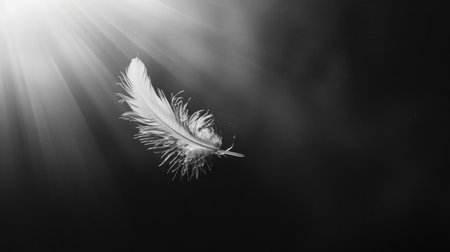 A minimalist shot of a single feather falling against a black background, under a single source of light, shot with a high-speed camera, capturing the delicate balance of nature