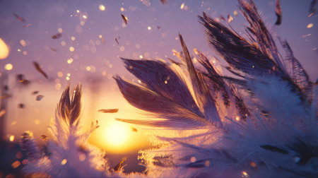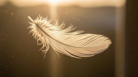 Delicate feathers gently resting soft surface, illuminated by warm sunlight, create serene and tranquil atmosphere. intricate details of feathers are highlighted, showcasing their natural beauty
