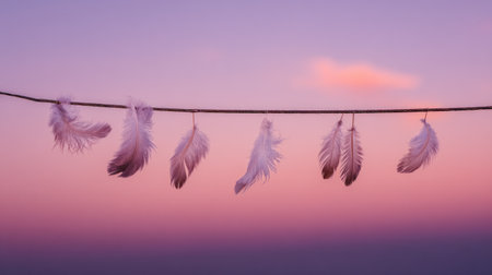 This image presents several white feathers suspended from a dark line, set against a gradient sky of pink and purple hues. The composition is simple, with a soft lighting. This versatile visual could be suitable for various commercial uses, including artistic designs or serene themes.