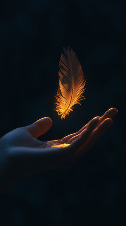 A delicate golden feather floating above a gentle palm in a dark setting, symbolizing lightness and hope