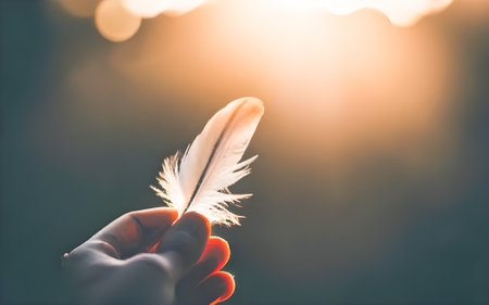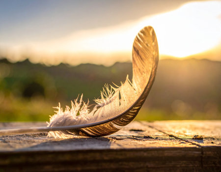 A single, delicate feather rests on a reflective surface, bathed in the warm, golden light of a setting sun. The soft bokeh in the background creates a magical and serene atmosphere, evoking feelings of peace, tranquility, and gentle hope.