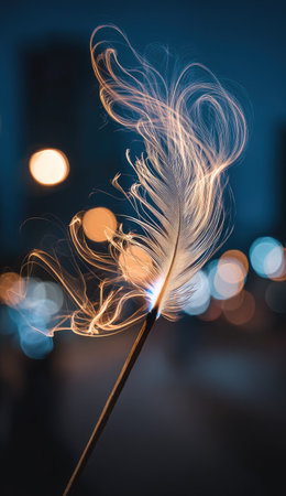 An illuminated feather forms the central subject, with light trails suggesting movement and energy. The scene features warm golden hues against a cool blurred backdrop. This artistic display of light and form could be used for conceptual projects, design elements, and decorative backgrounds.