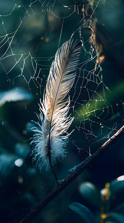 Delicate White Feather on Branch Soft Bokeh Background Nature Photography