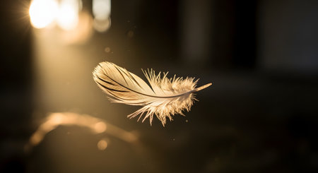 A delicate white feather floats weightlessly in the air against a dark background, illuminated by a warm sunbeam. Dust particles dance in the shaft of light, creating a spiritual, ethereal, and peaceful atmosphere.