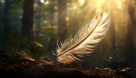 A single feather is suspended mid-air with light illuminating its delicate structure. The image features a shallow depth of field, with soft colors and textures. Sunlight filters through the background trees, suggesting an outdoor environment. Suitable for artistic projects, design elements, and editorial uses.