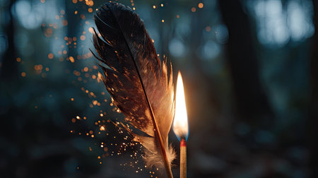 Burning feather in the dark forest. Selective focus. Shallow depth of field.