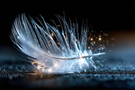 A delicate white feather rests on a soft, sparkling surface with subtle bokeh lights, representing new beginnings and gentle inspiration for your journey.