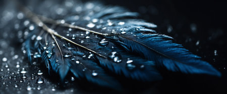 AI Generated. Feather of a bird in droplets of water on a dark background macro Silhouette of a blue and white feather abstract artistic image for design