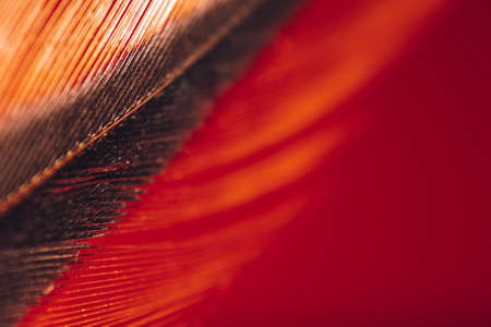 Bird feather on a red background close-up. Abstract background with soft focus