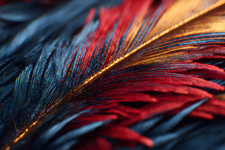 A vivid close-up of a feather showcases a blend of deep red, rich blue, and shimmering gold tones. The intricate details highlight the textures and patterns of nature's beauty.