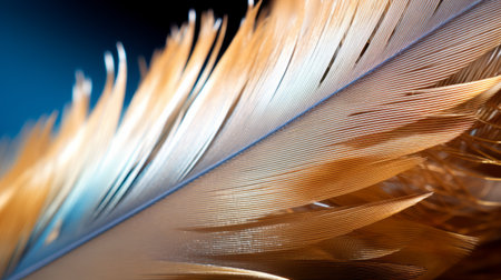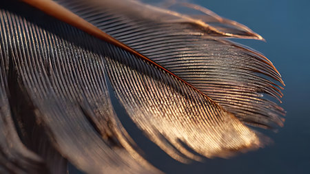 Feather bird wing detail in golden hour light. Extreme macro of barbule interlocking and nature softness.