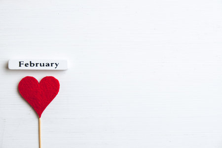 Heart near month february on wooden background with copy space.