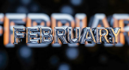 Metallic word February isolated on dark blurry background. 3d render of shiny silver text for celebration or seasonal design