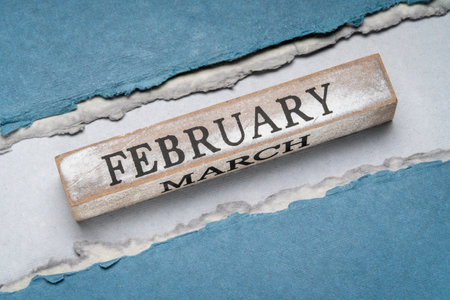 February text on grunge wooden block against handmade rag paper in blue tones, calendar concept