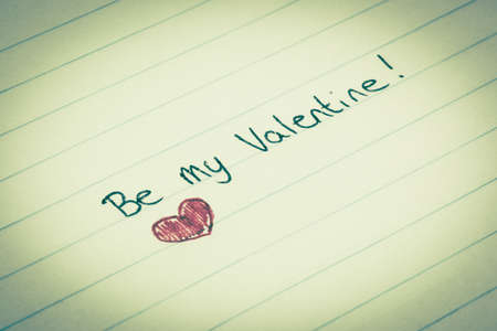 Be my valentine written on lined paper with a red colored heart