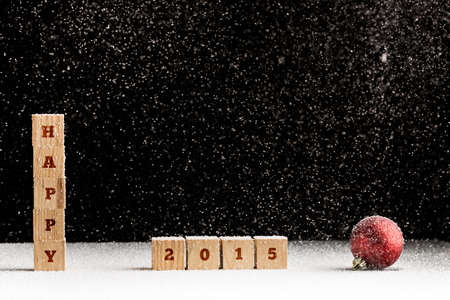 New Year 2015 background with falling snow and a red Christmas bauble with the word Happy spelled out on stacked wooden blocks with the date 2015 alongside over black with copyspace for your greeting.