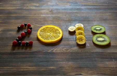 happy new year 2018 of fruit and berries on wooden background.