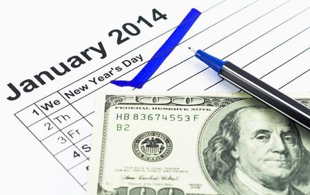 Blue check. Mark on the calendar at 1St January 2014 with usd money, new year's day