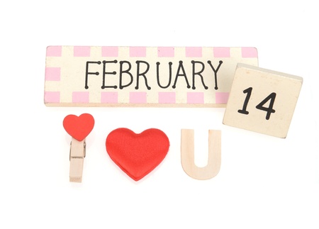 Wood calendar for February 14 on white background.