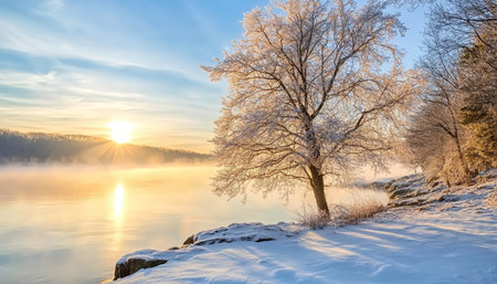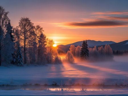 Majestic winter landscape featuring frosty trees and a serene river reflecting the vibrant sunrise