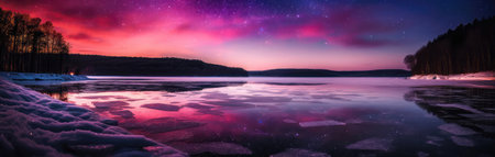Stunning Display Of Purple And Pink Lights Shimmering Above Frozen Lake, Reflecting Off The Water Below. Panoramic banner